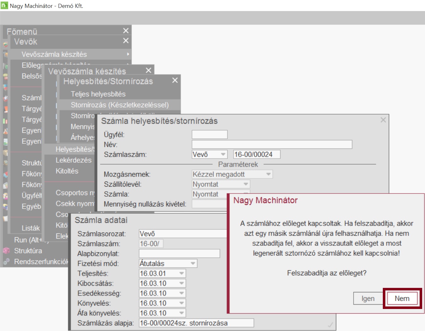 Az első lehetőség, hogy a befizetett előleget felszabadítjuk, azaz levesszük a sztornózandó végszámláról, hogy egy másik, későbbi végszámlához felhasználhassuk. Erre tipikusan akkor szokott sor kerülni, ha rendszeres ügyfélről van szó és biztosan fog még nálunk vásárolni.