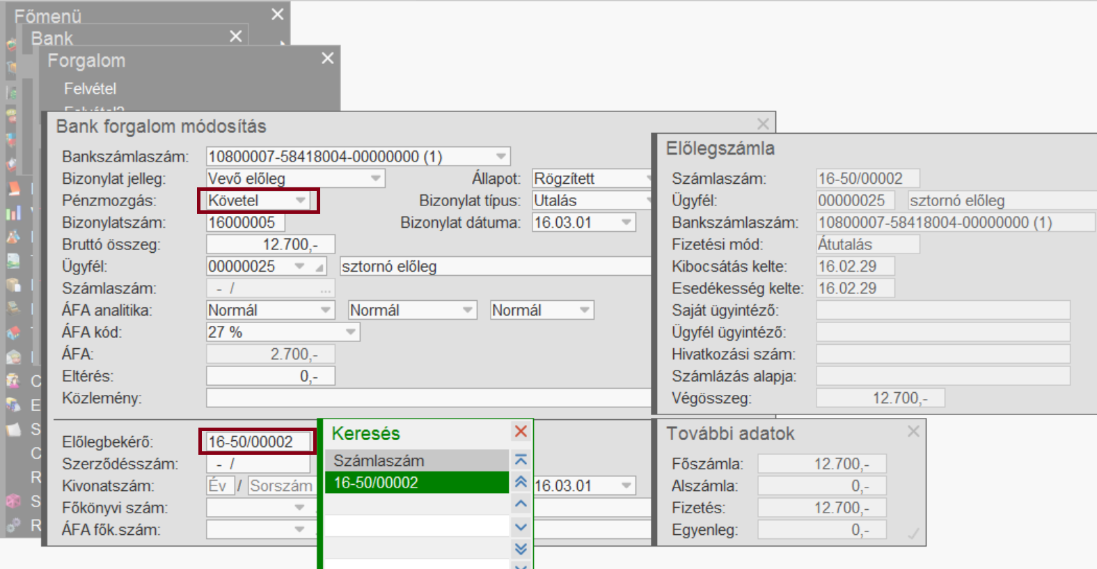Létre kell hozni egy (vevő, ill. export) előleg típusú bank (esetleg pénztár vagy valutapénztár) tételt, mely fordított irányú (követel, ill. kiadás), azonos összegű az eredeti előleggel és az előlegbekérő mezőbe be kell írni (választani) az eredeti előlegbekérő bizonylatot.