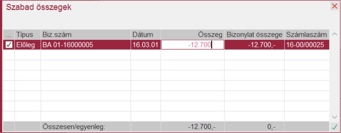 Ezután a program felajánlja a visszautalt (negatív előjelű) előleg számlához pontozását, amit meg is kell tennünk.