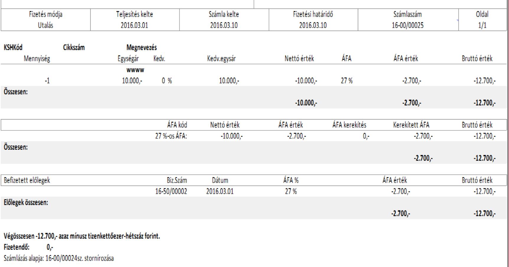 Ekkor létrejön a sztornó számla, melyen felhasznált előlegként rajta van a visszautalt összeg, így a sztornózott számlával (melyen rajta marad a befizetett előleg) együtt nulla lesz az egyenleg.