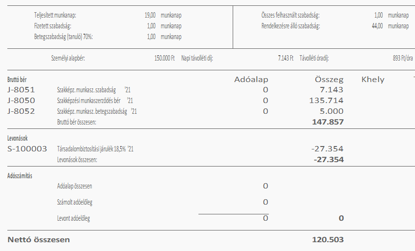 J8051 - Szakképz. munkasz. szabadság: adómentes, TB járulék kerül számfejtésre