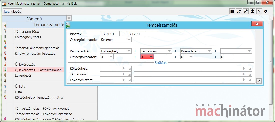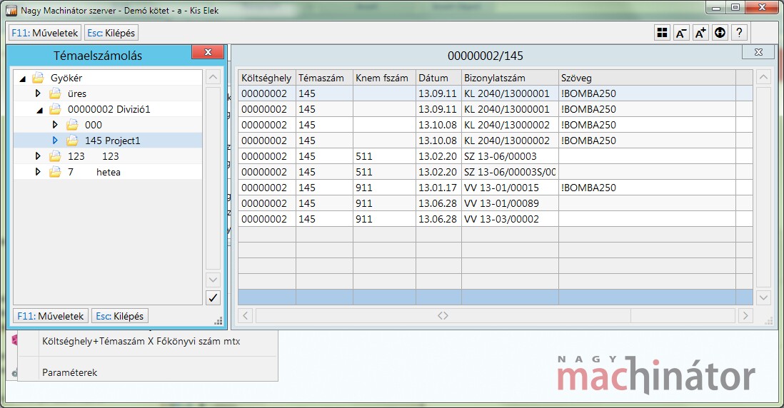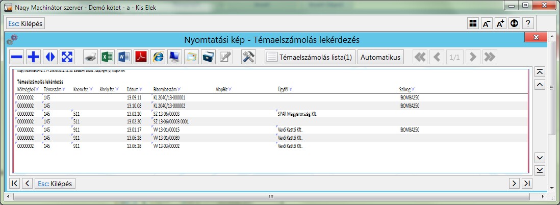Ebben a menüpontban lehet lekérdezni, ill. listázni az adott témaszám vagy költséghely forgalmát és meg lehet tekinteni az egyes bizonylatokat is.