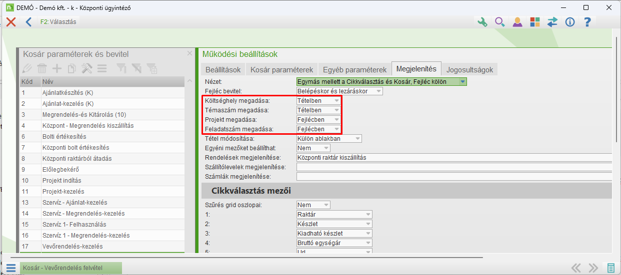 (Használata esetén érdemes még beállítani a Kosár paraméterek Megjelenítés fülén a Tétel módosítása: Külön ablakban értéket)