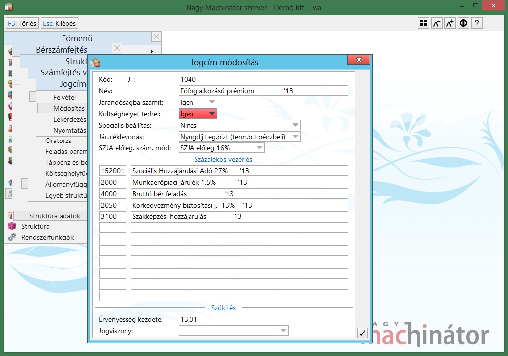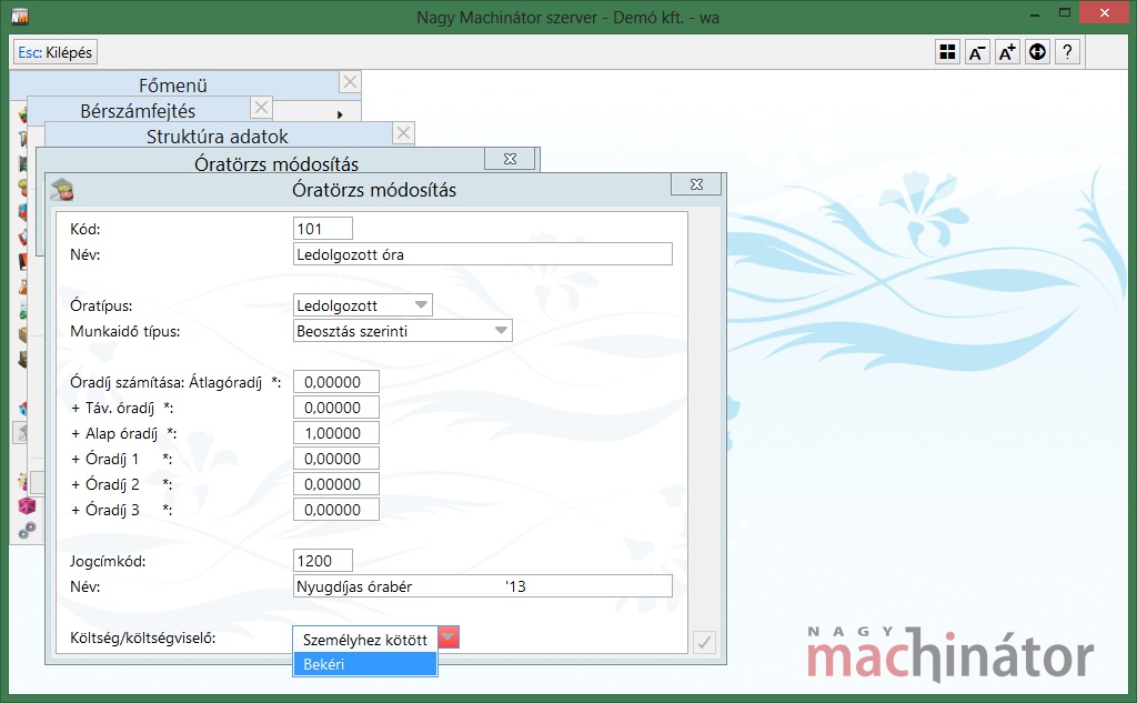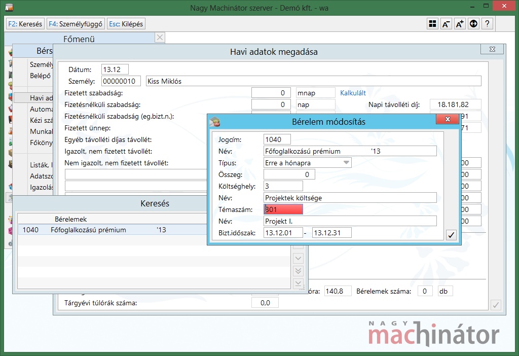 Amennyiben a dolgozó bére. általános költséget terhel (vagy nincs költséghely/téaszám szerint felosztva), de egy neki kifizetett pl. jutalom, vagy prémium (más) költséghely/témaszámhoz tartozik, úgy a havi alapbérén felül neki járó összeget bérelemként adhatjuk meg, amelyhez rendelhetünk külön költséghely/témaszámot. Ehhez az adott bérelemben engedélyeznünk kell, hogy a rá leszámfejtett összeg terheljen költséghely/témaszámot:
