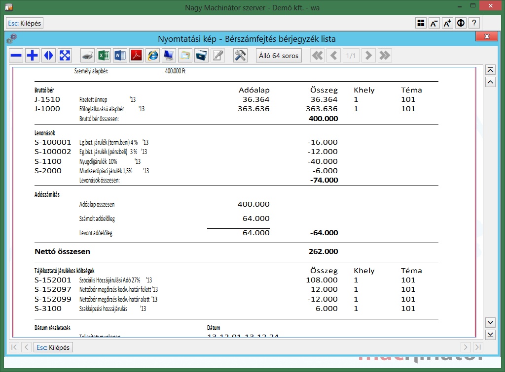 A havi adatok felvétele, és automata számfejtés után a bérjegyzéken a következő információkat fogjuk látni: Az óraszámok arányában megosztásra kerül mind a bruttó bér, mind a járulékos költségek.