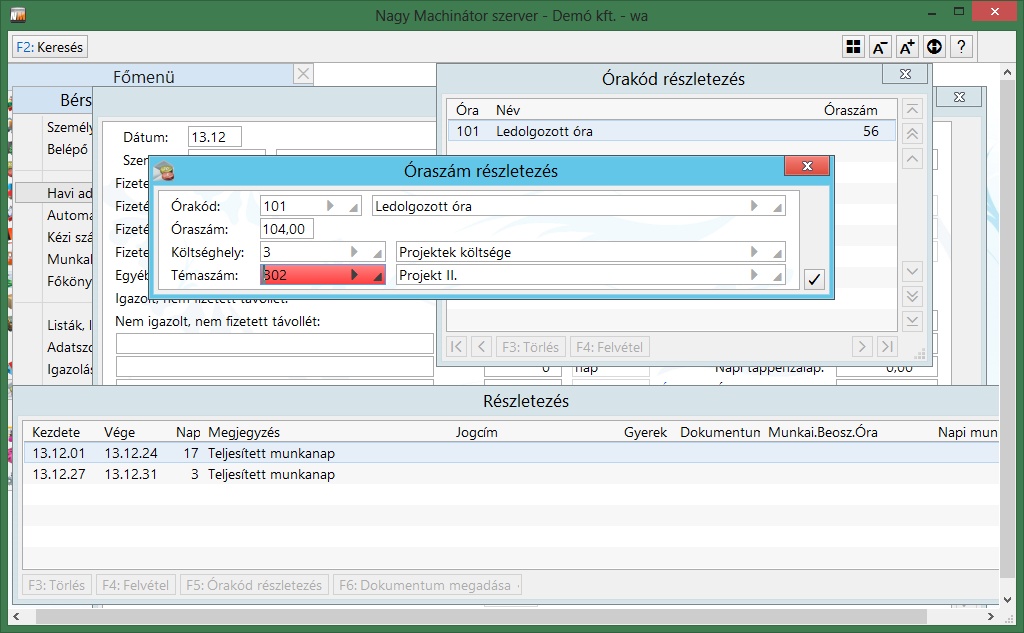 A havi adatok bevitelénél a teljesített munkanap mezőn állva F4: Részletezés funkciót kell választani, majd azon belül F5: Órakód részletezése. Itt udjuk megadni az óraszámhoz tartozó költséghely/témaszámot.