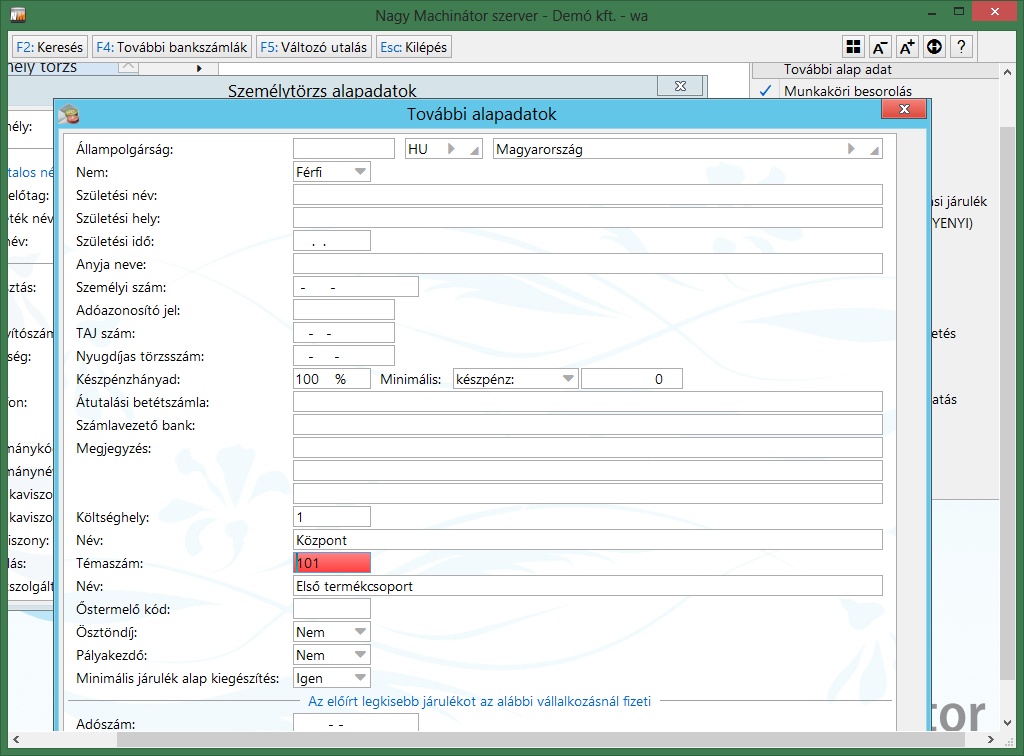Ekkor a Személytörzs / További alapadatok menüpontban van lehetőségünk megadni a személyhez tartozó Költséghely/Témaszámot.