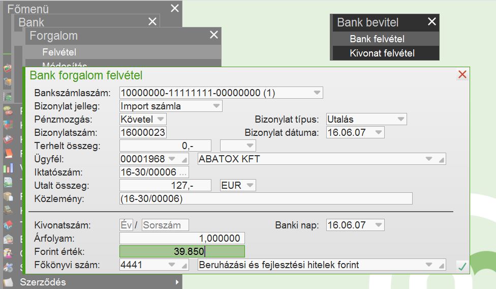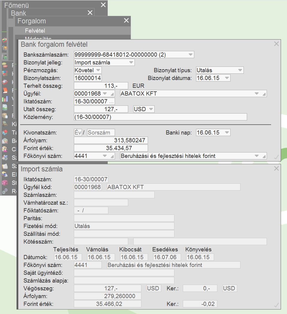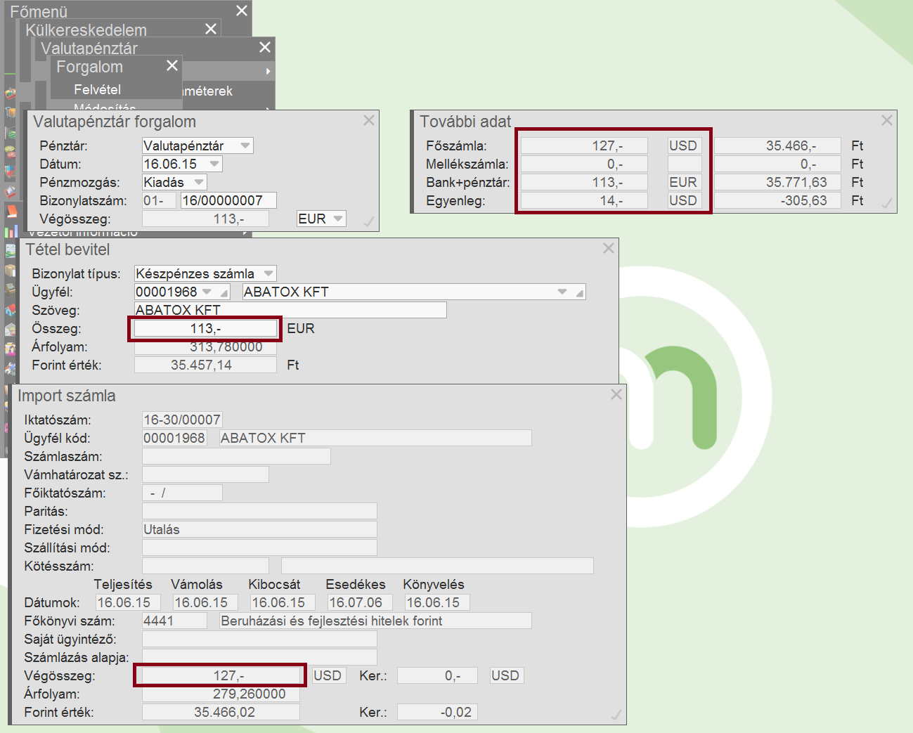 Követel irányú pénzmozgásnál automatikus árfolyam kezelés esetén a program adja az árfolyamot, ami eltérhet a bank által használt árfolyamtól, de Tartozik pénzmozgásnál is előfordulhat, hogy program által használ árfolyamban a más forint összeg jön ki, mint a ténylegesen utalt összeg. A Forint összeg és az Utalt összeg közötti különbözetet a Főkönyvi paraméterekben megadható Devizabank árfolyam nyereség/veszteség számlára könyveli el a program.