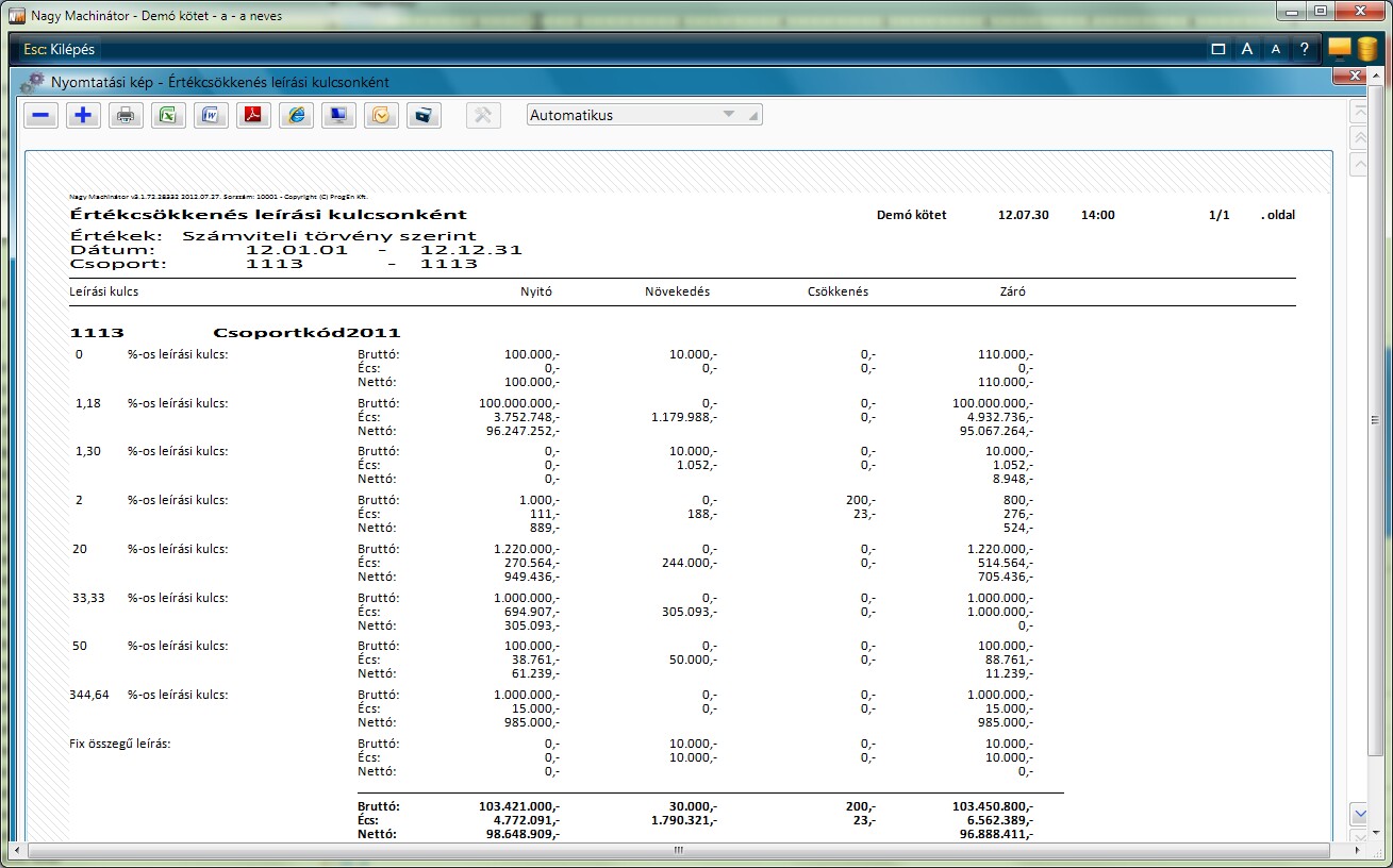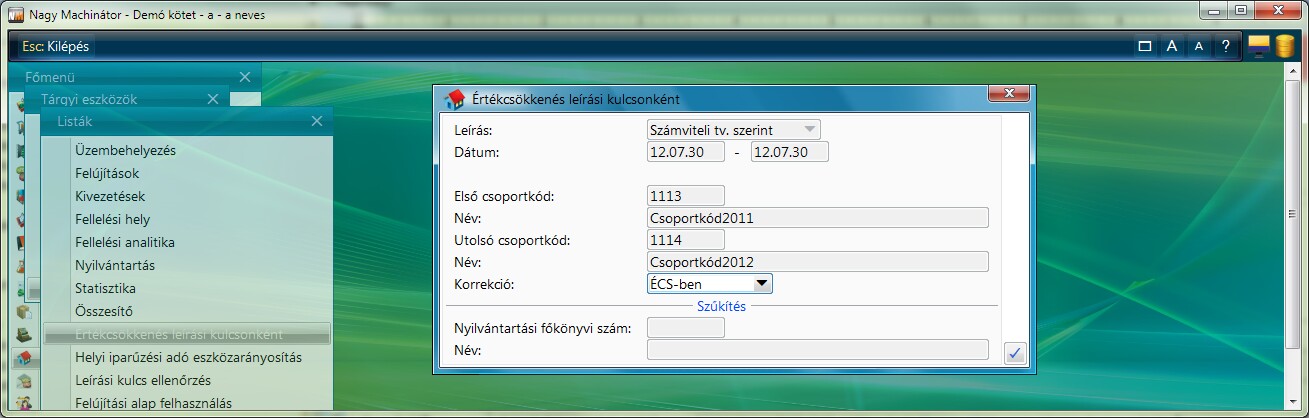 Az akcióval a megadott időszakban történt értékcsökkenéséről csoportkód bontásban készíthetünk listát.