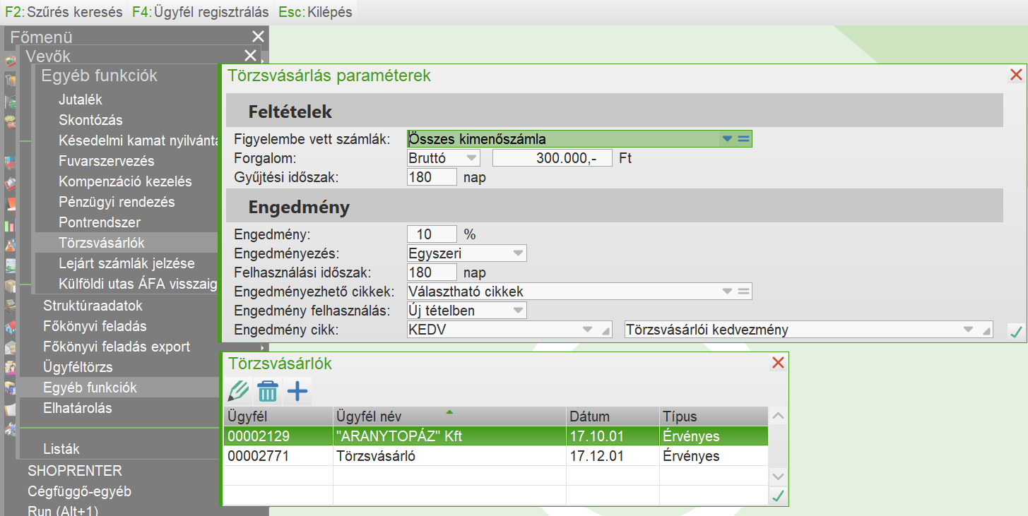 A funkcióval a Pontrendszertől függetlenül törzsvásárlói kedvezmény kezelhető a Vevő és a Kiskereskedelem modulokban kiállított forintos számlákra.