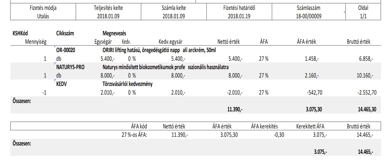 Beállítás szerint a számla összes tételére érvényesíthető a kedvezmény vagy egy új (negatív értékű) kedvezmény tétellel érvényesíthetjük azt.