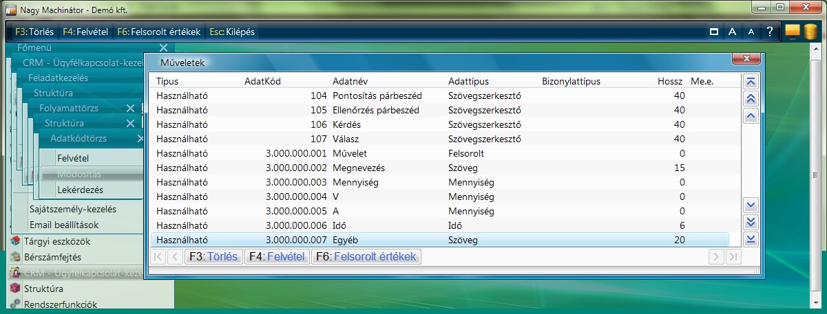 A CRM modul munkafolyamataiban és az Extramező kezelés adatalapjain használható adattípusokat lehet definiálni ebben a funkcióban.