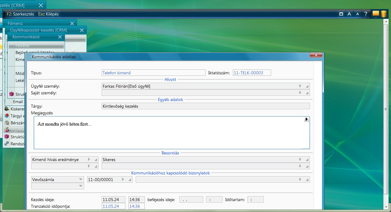 Az Ügyféllel folytatott kommunikációt a Kommunikáció modulban kell rögzíteni. A kommunikáció irányától függően kell gyűjtőt választani és be kell jegyezni az ügyféllel folytatott beszélgetést.