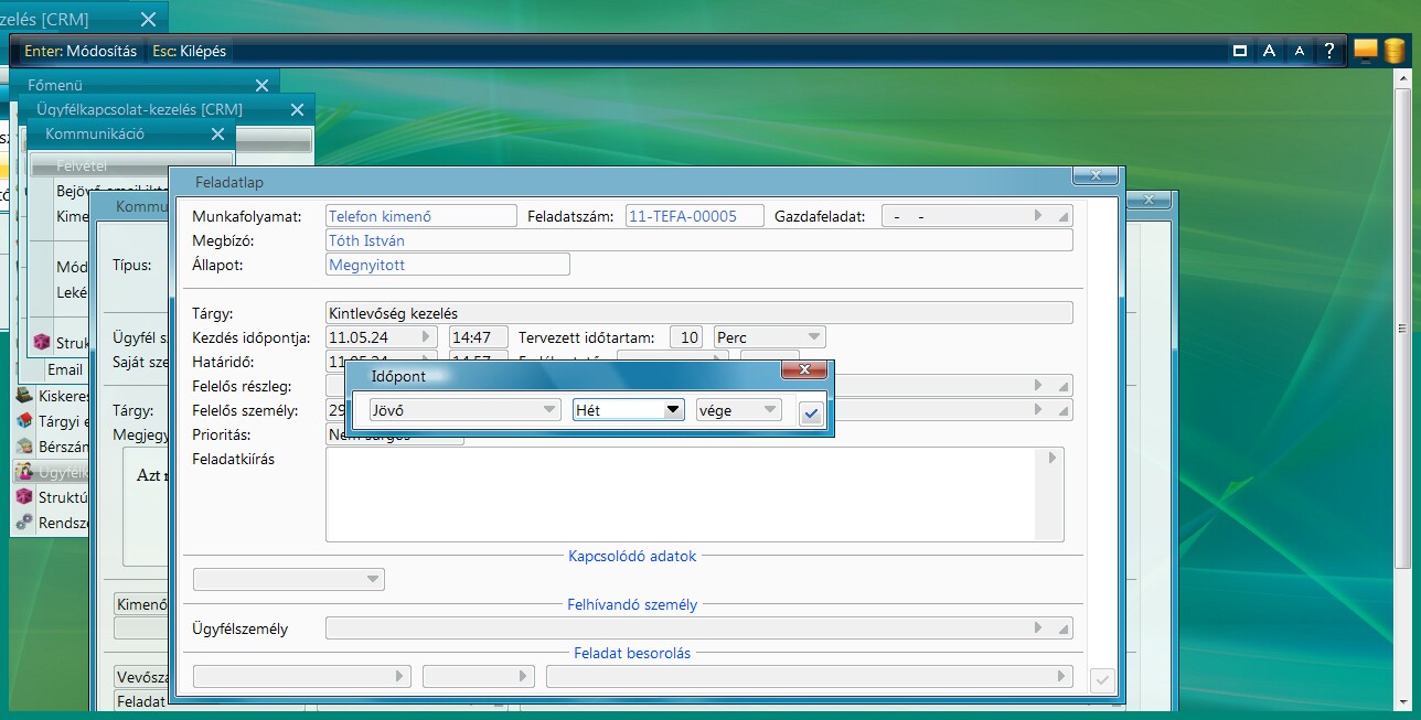Ha igennel válaszolunk, és megjelenő ablakban a Feladat felvétel műveletet választjuk, akkor rögtön felvehetünk magunknak (vagy valaki másnak) egy feladatot.