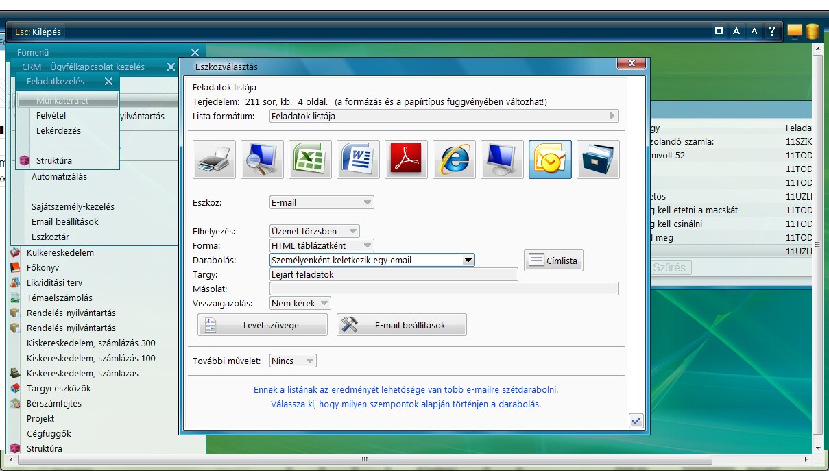 Akinek már van szűrés változata, listaformátuma, helyesen be tudja állítani az Eszközválasztás ablakot, az a feladatkezelés nyomtatás üzemmódjában, anélkül, hogy a szűrés eredményét megtekintené, közvetlenül ki tudja nyomtatni, vagy emailezni tudja a címzetteknek.