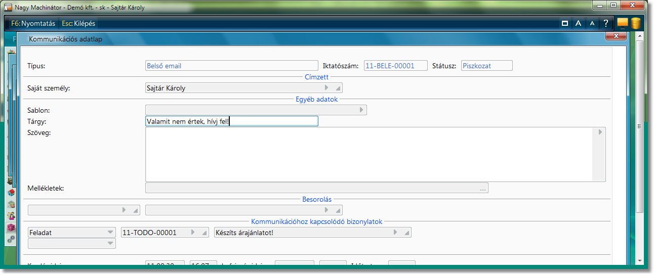 Ha a Megbízó személy értéket választjuk, akkor elindul a Kommunikáció funkció, ahol Belső email gyűjtőt érdemes választani és máris lehet kérdést feltenni a megbízónak.