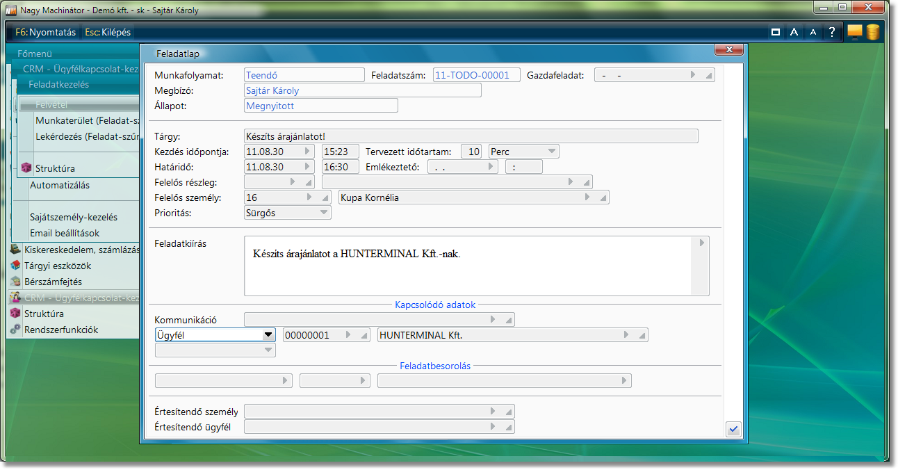 A feladatnak nem kell közvetlen kapcsolatban lennie a vállalatirányítási rendszer egyéb elemeivel. Akármilyen feladatok kiadására lehetőség nyílik (Pl.: Vidd fel a dossziét a Főnöknek!).