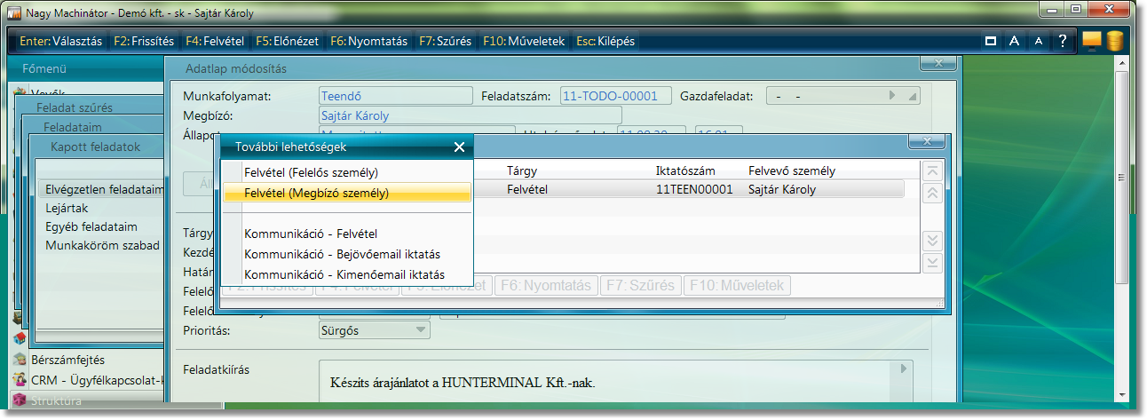 Az adatlapon a Kommunikáció gomb megnyomása után megjelenő ablakban F4-Felvétel funkció után kiválaszthatjuk, hogy kivel akarunk kommunikálni (lásd kép).