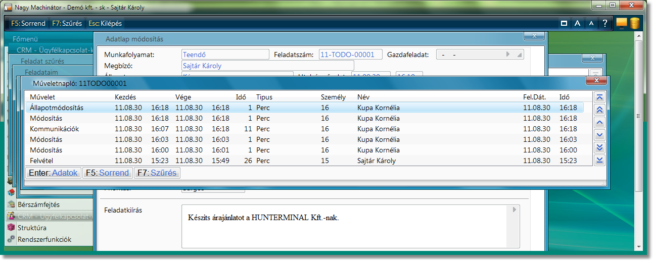 A Műveletnapló mindenről részletes felvilágosítást fog nyújtani: Ki vette fel a feladatot, és milyen adatokat adott meg. Milyen adatok módosultak és ki módosította őket. Kinek lett kiosztva a feladat és a kiosztott feladatok milyen állapotban vannak. Ki hajtotta végre végül is a feladatot és mikor..