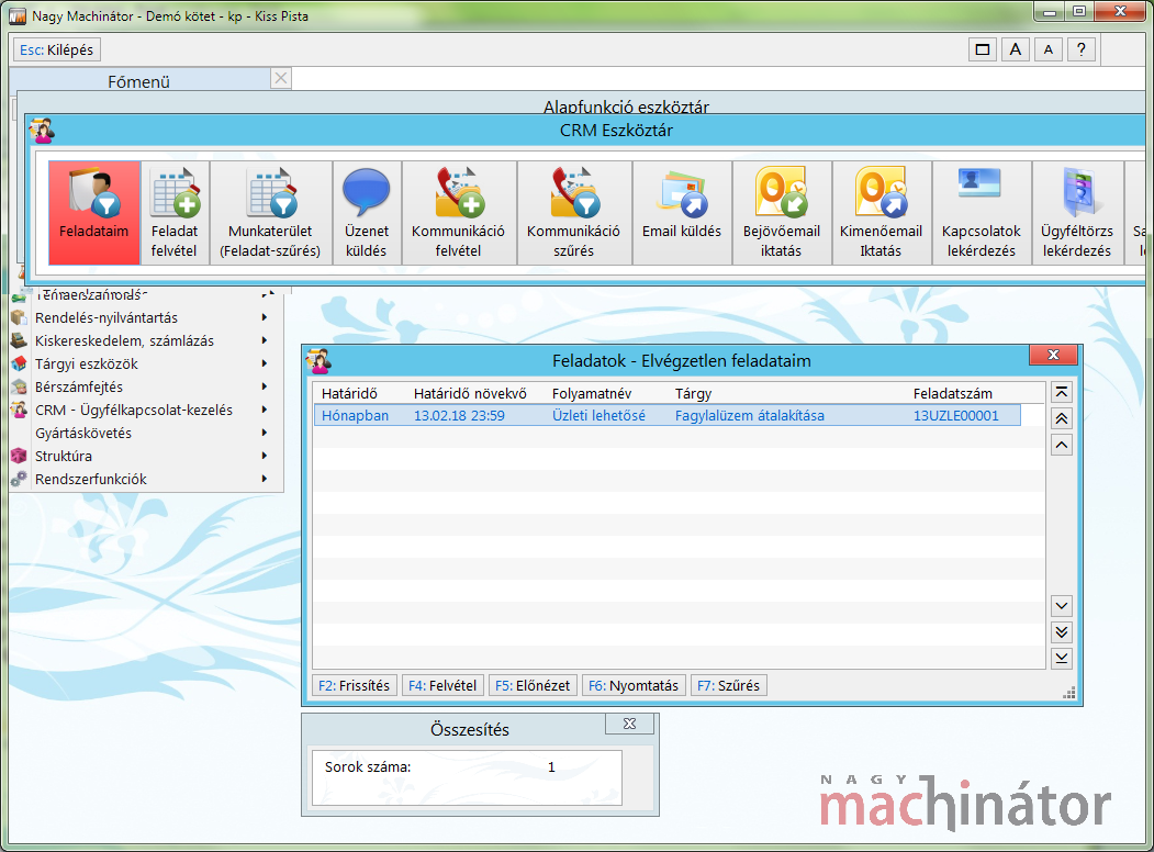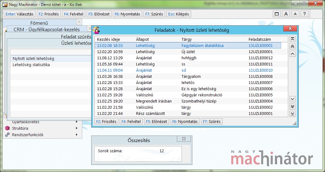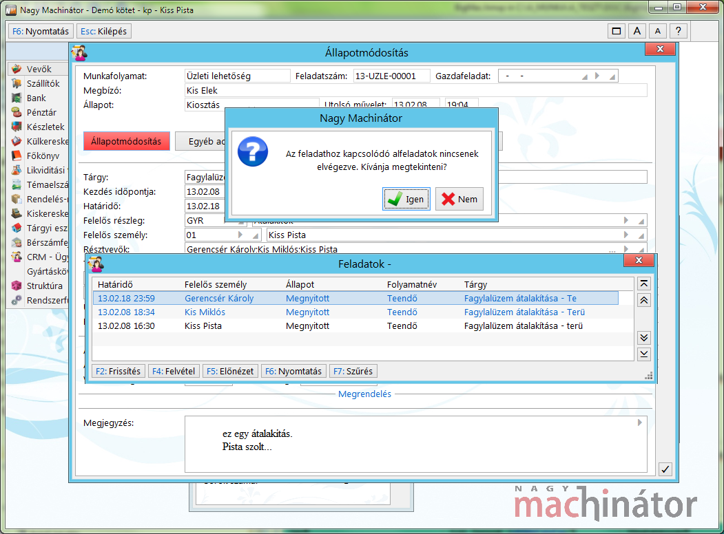 A következő állapot az ajánlat kiküldése lenne. Amennyiben állapot módosítás gombot megnyomjuk és az üzleti lehetőség alá generált alfeladatokat még nem hajtották végre a program figyelmeztet erre és meg lehet tekinteni a nyitott alfeladatokat.