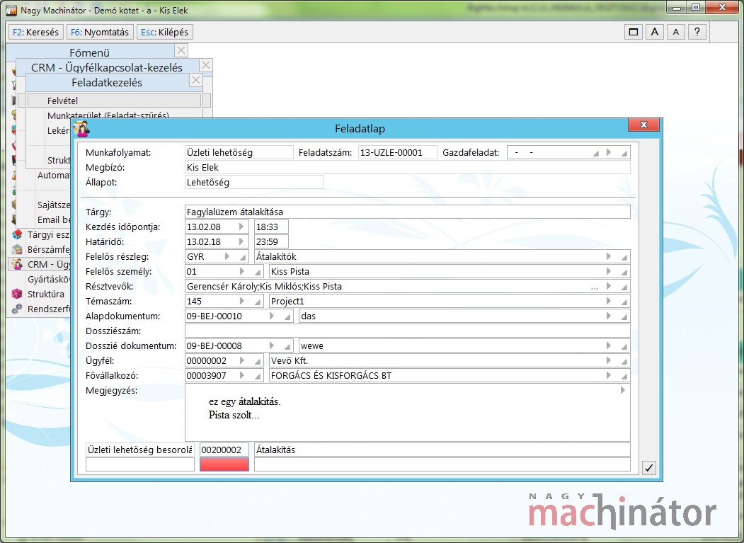 Az üzleti lehetőség adatlapjáról leolvashatja, hogy milyen paraméterekkel rendelkezik a projekt, továbbá lehetősége van további alfeladatokat kiosztani a megrendelésre vonatkozóan.