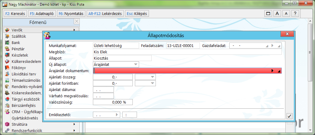 Meg kell adni az ajánlat dokumentum modulba iktatott számát (az iktatás az állapot módosítás ablakból is végrehajtható) és meg kell adni az ajánlat összegét, határidejét stb...
