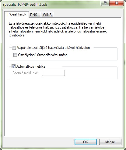 3.kép ki kell venni a pipát az "Alapértelmezett átjáró használata a távoli hálózaton" címke elől