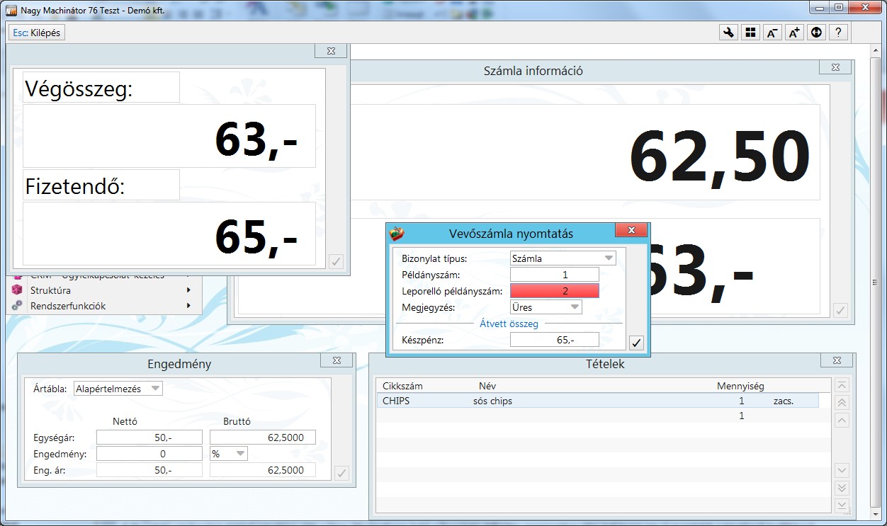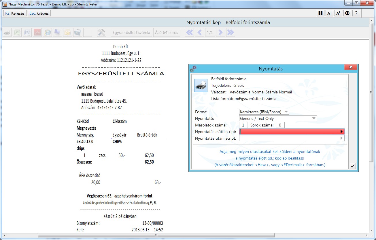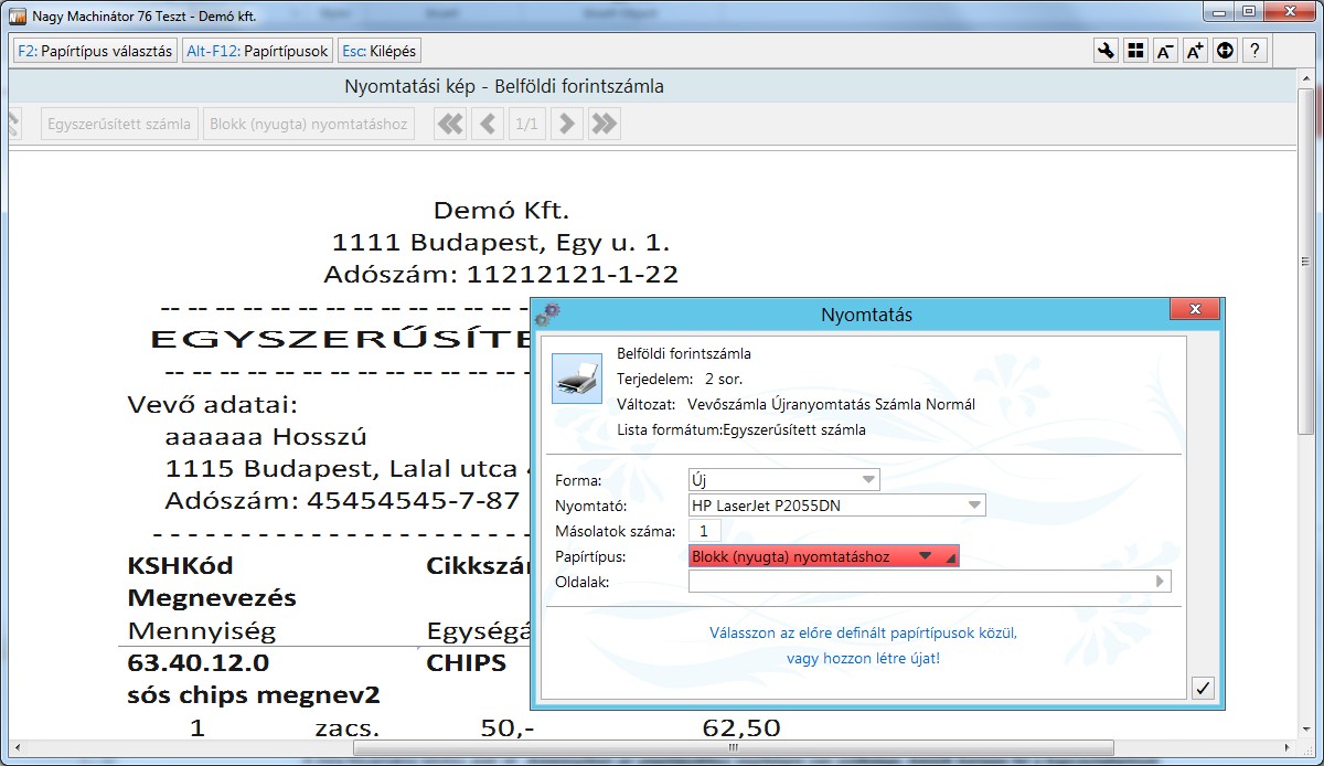 A számla felvételét követően 2 leporelló példányben kell nyomtatni az egyszerűsített számlát.