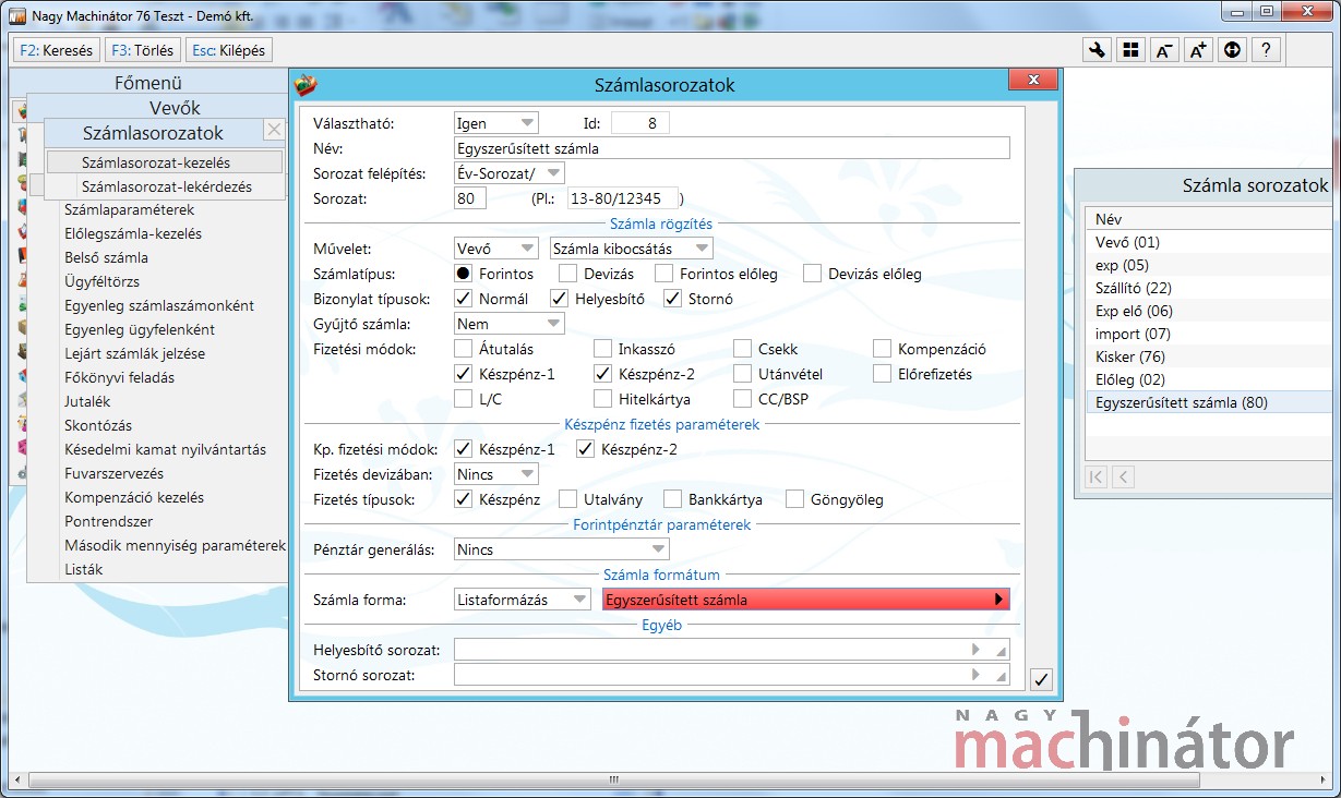A Vevők/Számlasorozatok/Számlasorozat-kezelés menüpontban fel kell venni egy sorozatot.