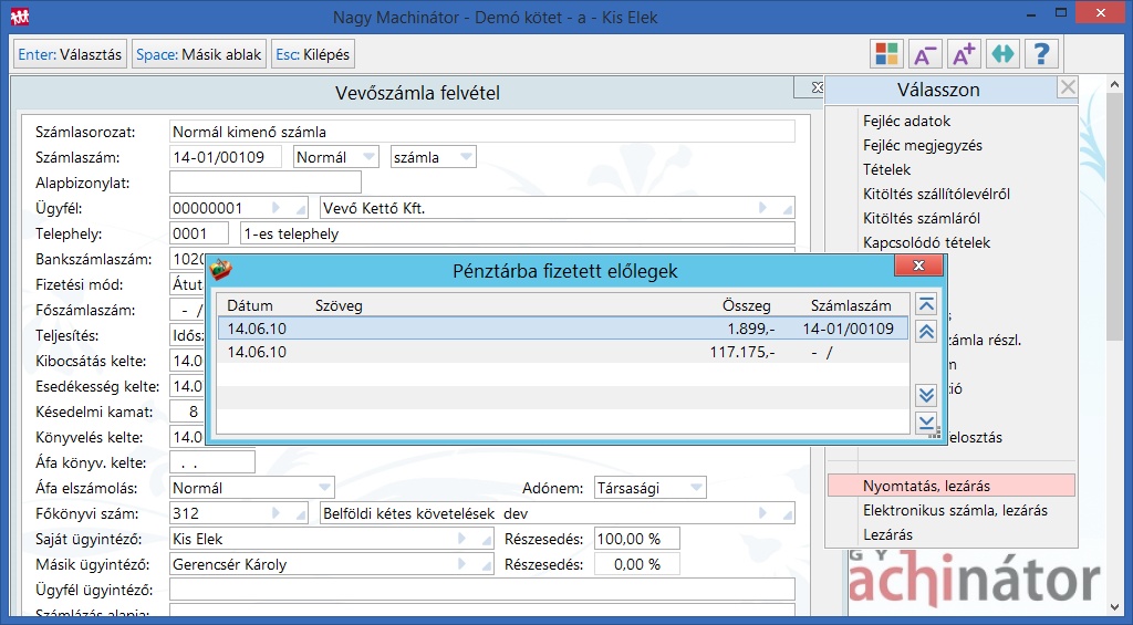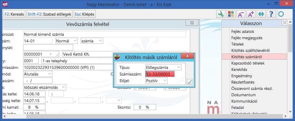 Miután a bankba vagy a pénztárba az előleg rögzítése megtörtént, el kell indítani a normál számlázásra használt funkciót: Vevőszámla generálás, Export számla generálás