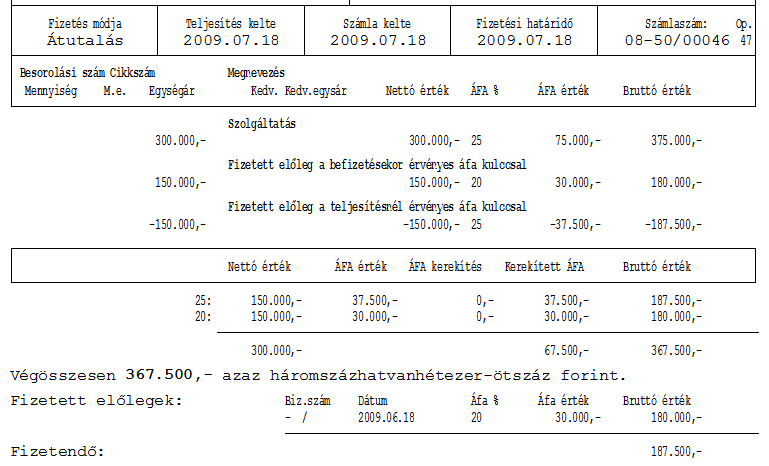 Az alábbi példa az Apeh honlapon megjelent 2009.06.16-án megjelent állásfoglalás alapján készült, ezért még a 20%-ról 25%-ra átállást tartalmazza!
