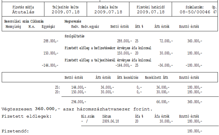 Ezt a Nagy Machinátorban úgy lehet elérni, hogy mivel a felek bruttó összegben állapodtak meg, a számla tételét úgy kell felvenni, hogy a szerződés szerinti bruttó értéket tartalmazza, majd az előleg szabályos számlához kapcsolásán kívül két technikai tételt kell felvenni a számlához. Az egyik tételben negatív összeggel szerepel a bruttó előleg az új áfa kulccsal, a másik tételben plusz összeggel szerepel a befizetéskor érvényes áfa kulccsal