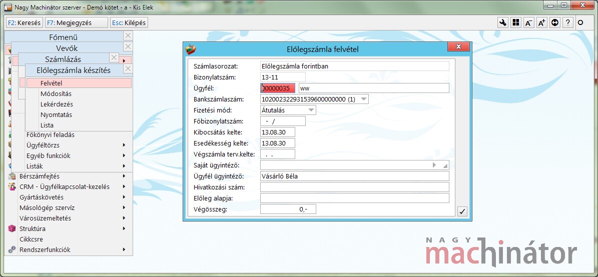 Az akció a belföldön forintban kiállított előlegszámlák felvételére, módosítására, lekérdezésére és sztornírozására szolgál.