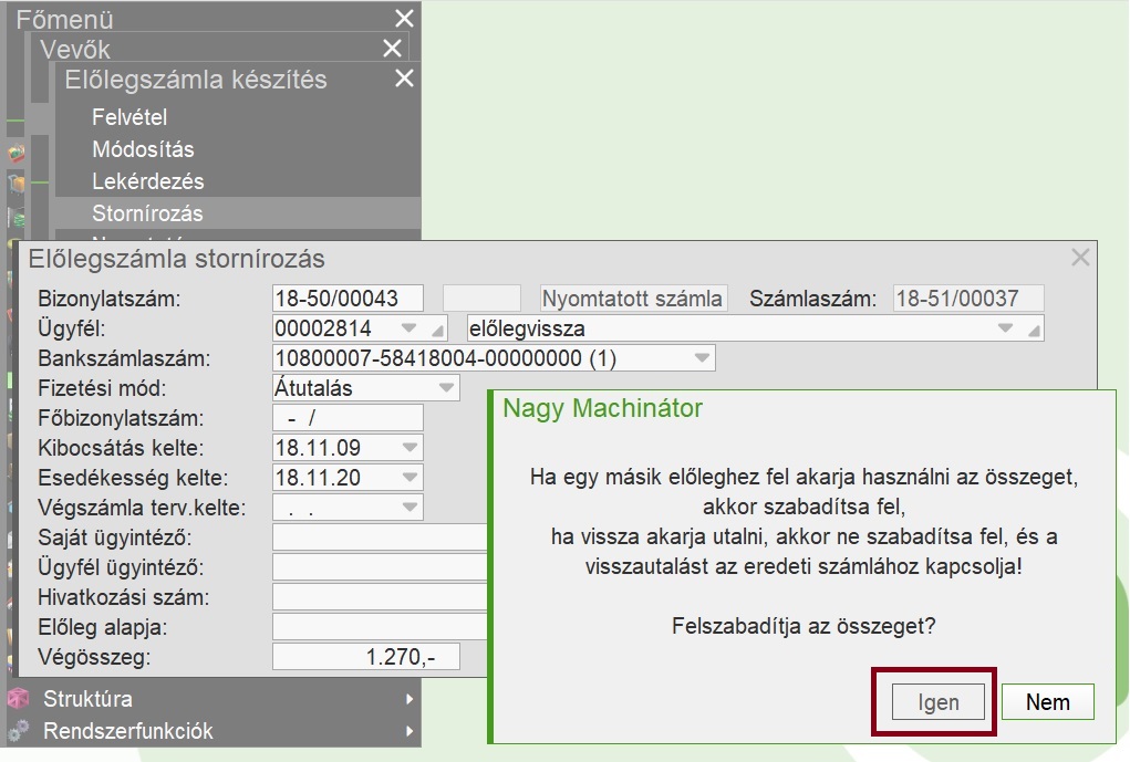 A Sztornózás menüponttal létrehozhatunk egy sztornó előlegszámlát, majd a bankban/pénztárban felvehetünk egy követel/kiadás irányú előleg jellegű bizonylatot, melynek Előlegbekérő mezőjébe az eredeti (pozitív irányú) bekérő számát választjuk.