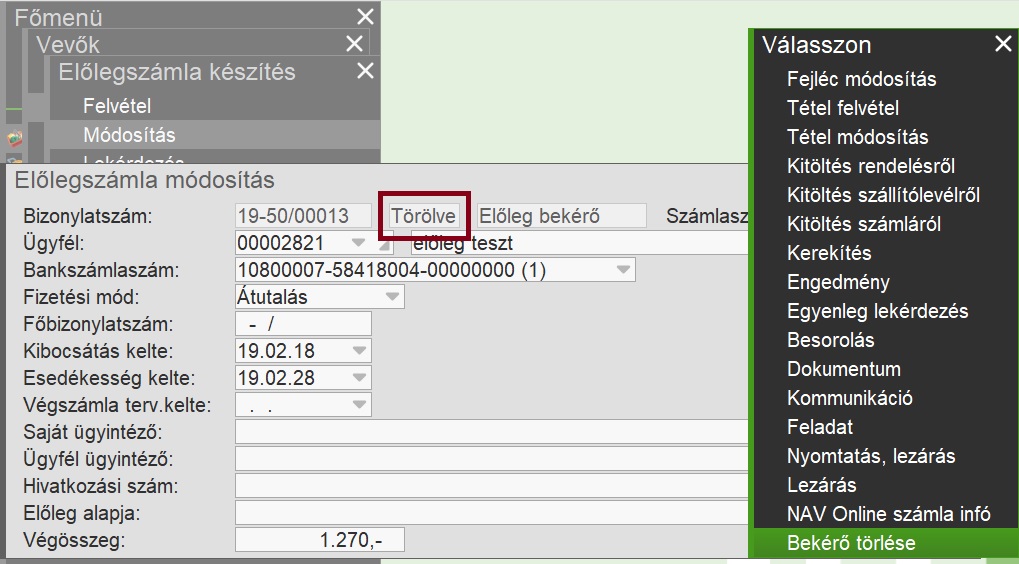 Olyan bekérőt, amely nem lett még kifizetve és biztosan tudjuk, hogy nem is lesz, ki lehet törölni a Fejléc módosításban F3-mal, amennyiben a sorozat utolsó bizonylata. Számla fejléccel nyomtatott előlegszámlát nem lehet törölni, de egy olyan bizonylatot, amelyhez banki/pénztári fizetés van már kapcsolva, de nincs Számla fejléccel kinyomtatva, szintén ki lehet törölni.