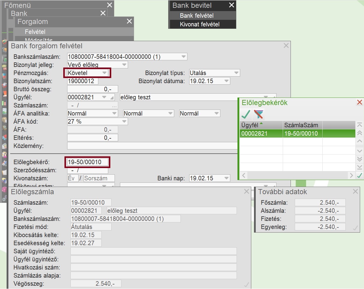 A másik módszer, hogy kézzel létrehozunk egy olyan bekérőt, mely a Főbizonylatszám mezőben hivatkozik a visszafizetendő előlegszámla bekérőjére, a tételeket pedig a Kitöltés számláról alponttal negatív jelleggel vesszük át a Főbizonylatszám-ból. Ezután (mint a Sztornózás esetében) a bankban/pénztárban felveszünk egy követel/kiadás irányú előleg jellegű bizonylatot, melynek Előlegbekérő mezőjébe az eredeti (pozitív irányú) bekérő számát választjuk. Végül az Előlegszámla módosításban kinyomtatjuk a kifizetett bekérőt előlegszámlaként. Amennyiben az előlegszámla sorozatra be van állítva az azonnali pénztártétel generálás, készpénzes helyesbítő bekérő esetén létrejön egy kiadás irányú pénztártétel és a negatív előlegszámla is azonnal kinyomtatható.
