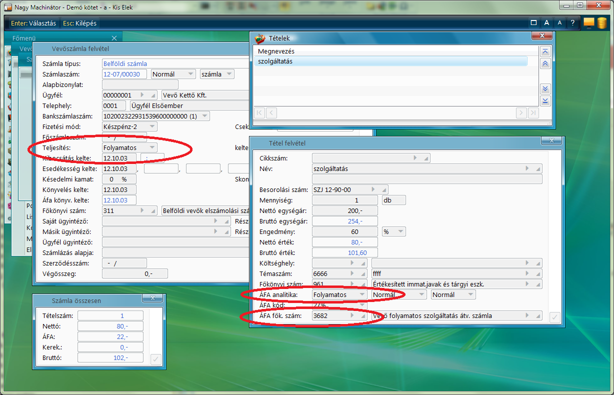 Majd a főkönyv paraméterekben a Vevő folyamatos szolgáltatás sort a következők szerint kell kikontírozni: