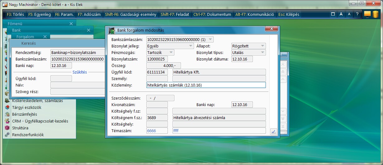 A program figyelni fogja a Bankkivonat rögzítést, és ha a Hitelkártya cég fizet, akkor a Hitelkártya pénztárban is mozgást fog generálni automatikusan.