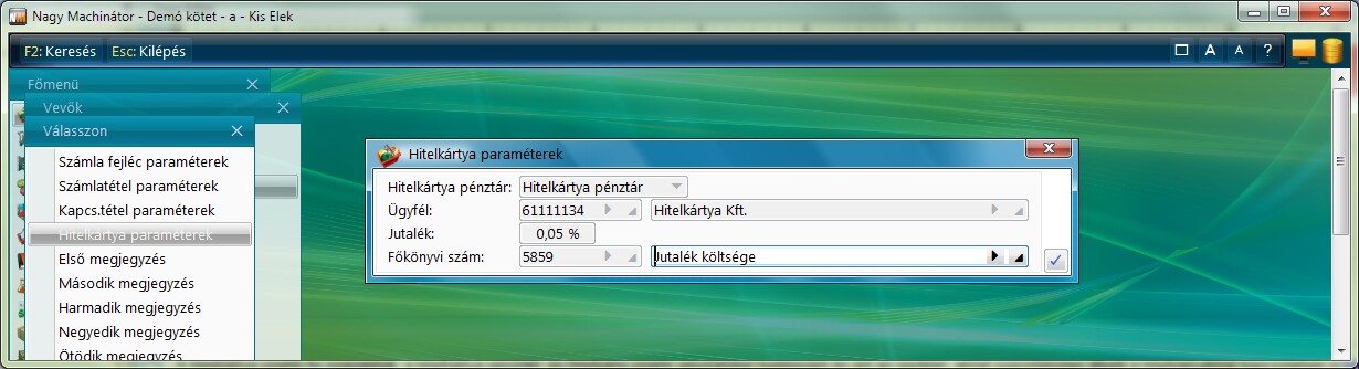 A hitelkártya jutalék fix százalékát, a hitelkártya pénztárt, és hitelkártya jutalék pénztártétel kontírozást és azt az ügyfelet, akivel szerződésben állunk a hitelkártyákkal kapcsolatban a hitelkártya paraméterekben kell megadnunk a vevőszámla paramétereken belül.