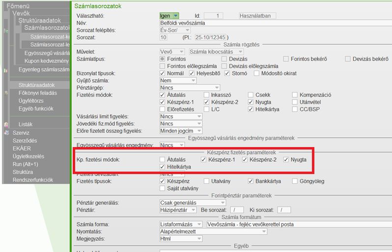 A Számlasorozatokban sorozatonként külön-külön meg kell adni, hogy az adott sorozatban a hitelkártyás fizetés készpénzesnek minősüljön: