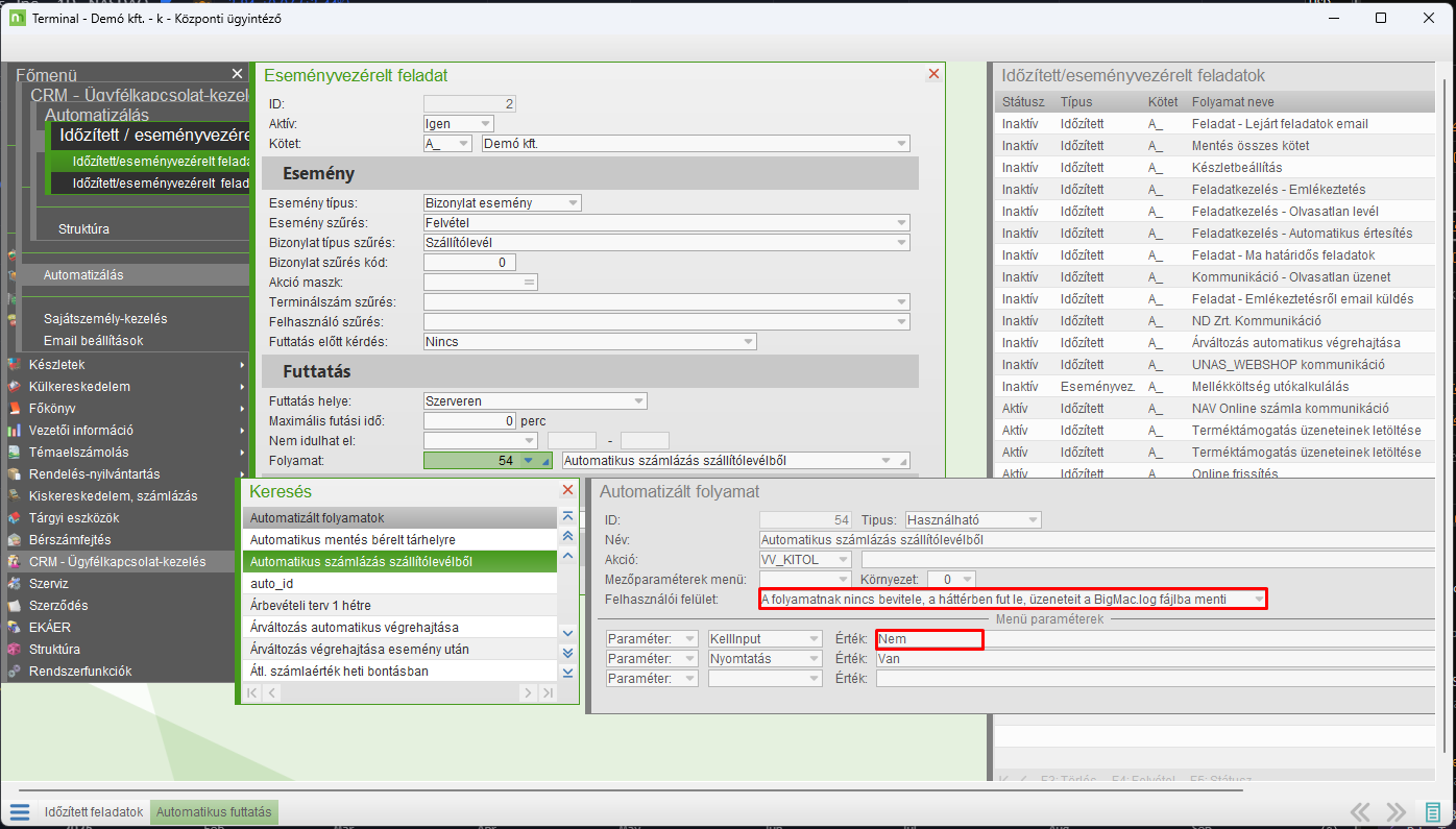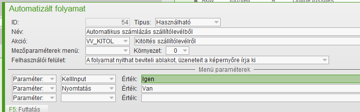 Az alábbi képen látható, hogyan kell paraméterezni a funkciót ahhoz, hogy felhasználói bevatkozás nélkül automatikusan lefusson.