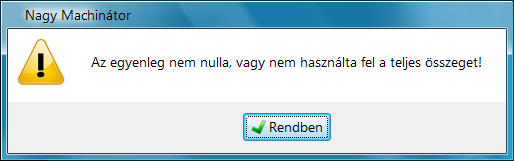 A bizonylat mentése. A bizonylat nem menthető addig, amíg az elszámolás egyenlege nem lesz nulla. Ilyen esetben a következő üzenet jelenik meg: