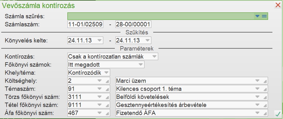 Itt megadott: Az alábbi három főkönyvi számmal fogja kikontírozni a szűkített számlákat a program. Számla paraméterekből: A fejléc és a tétel paraméterekből veszi a program a kontírozáshoz az értékeket. Ebben az esetben a főkönyvi számokat bekérő mezők nem jelennek meg.. |