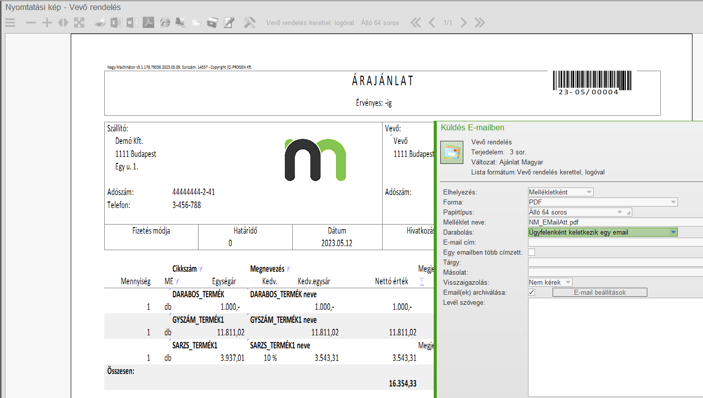 A generálás után lehetőség van az ajánlatot emailben elküldeni az ügyféltörzsben megadott emailcímére.