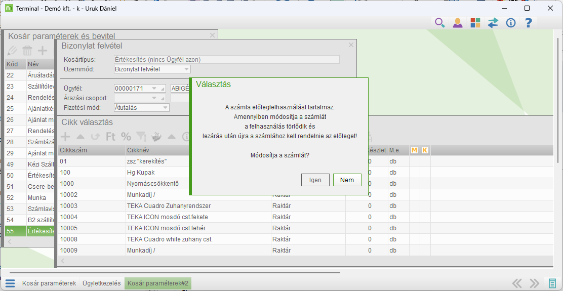 Kosár funkció alkalmas arra, hogy egy számlát úgy módosítson, hogy a kapcsolódó szállítólevelet és rendelést is módosítsa.