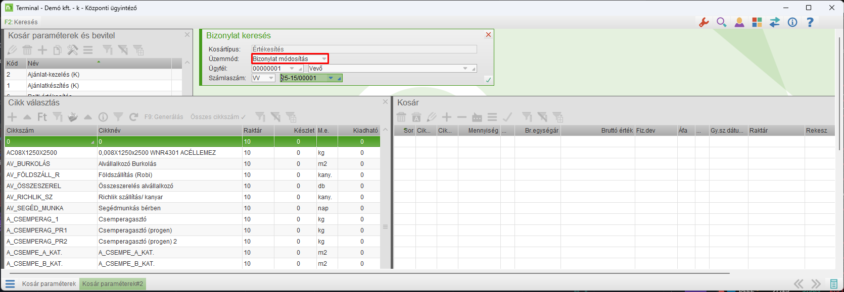 A kosárral bizonylatok összevont módosítását is végre lehet hajtani.