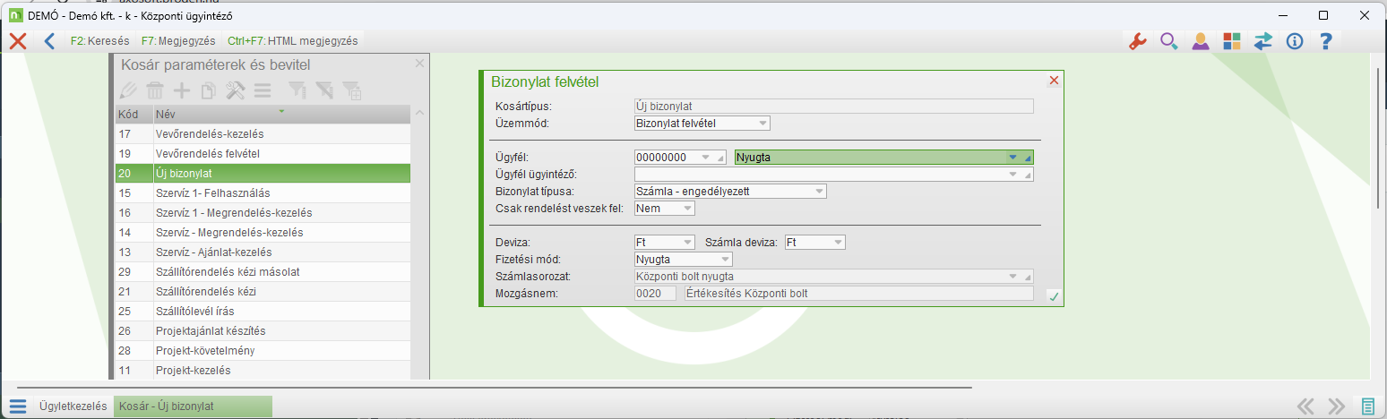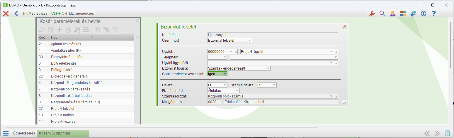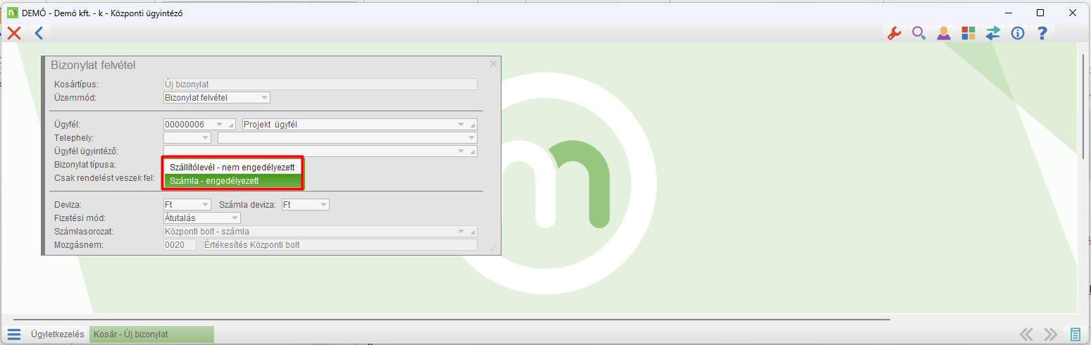 A Kosár elindítása a funkció lehetőséget biztosít arra, hogy a felhasználó eldöntse, hogy milyen bizonylat készüljön az ügyfélnek, számla vagy szállítólevél.