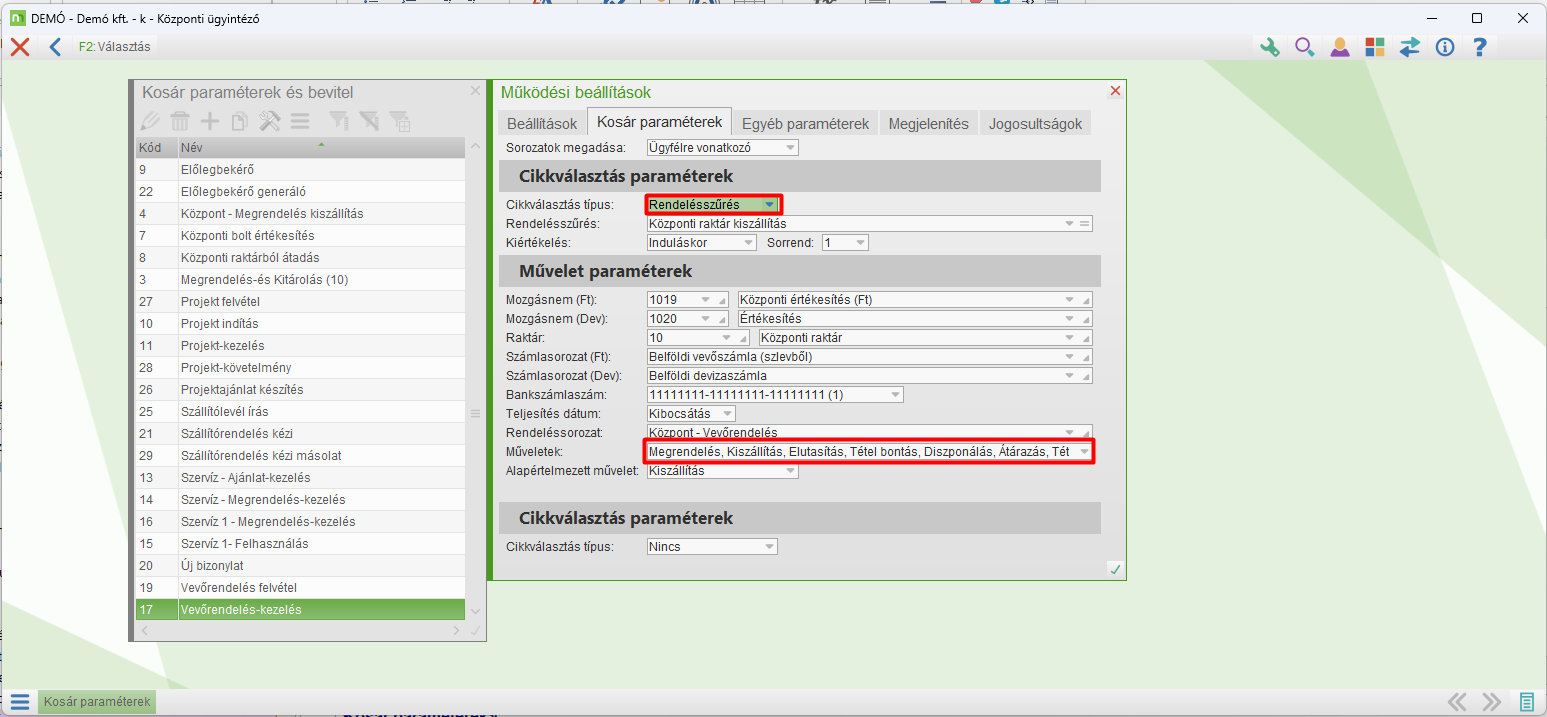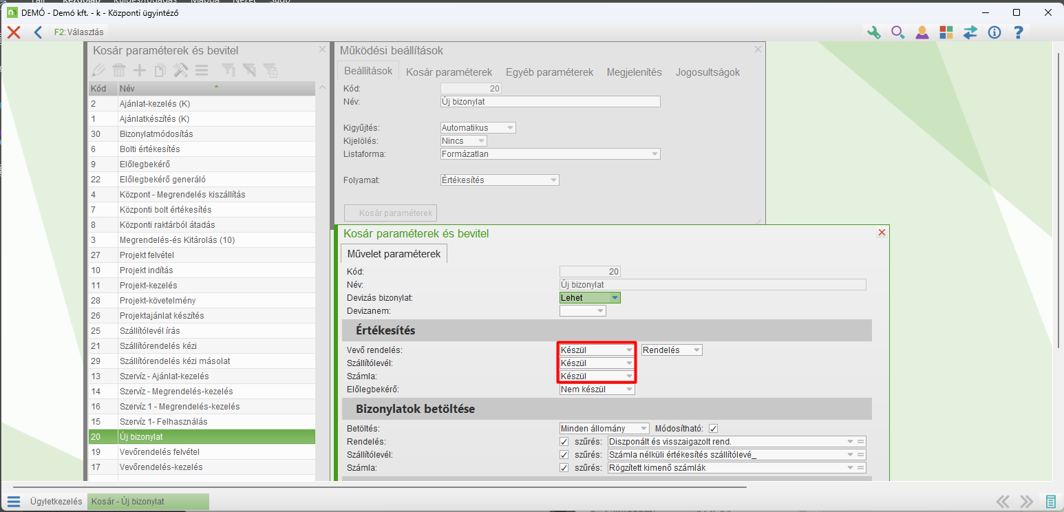 A Kosár funkció és az Ügyletkezelés funkciók összehangolt paraméterezése esetén a következők szerint tud működni a program.