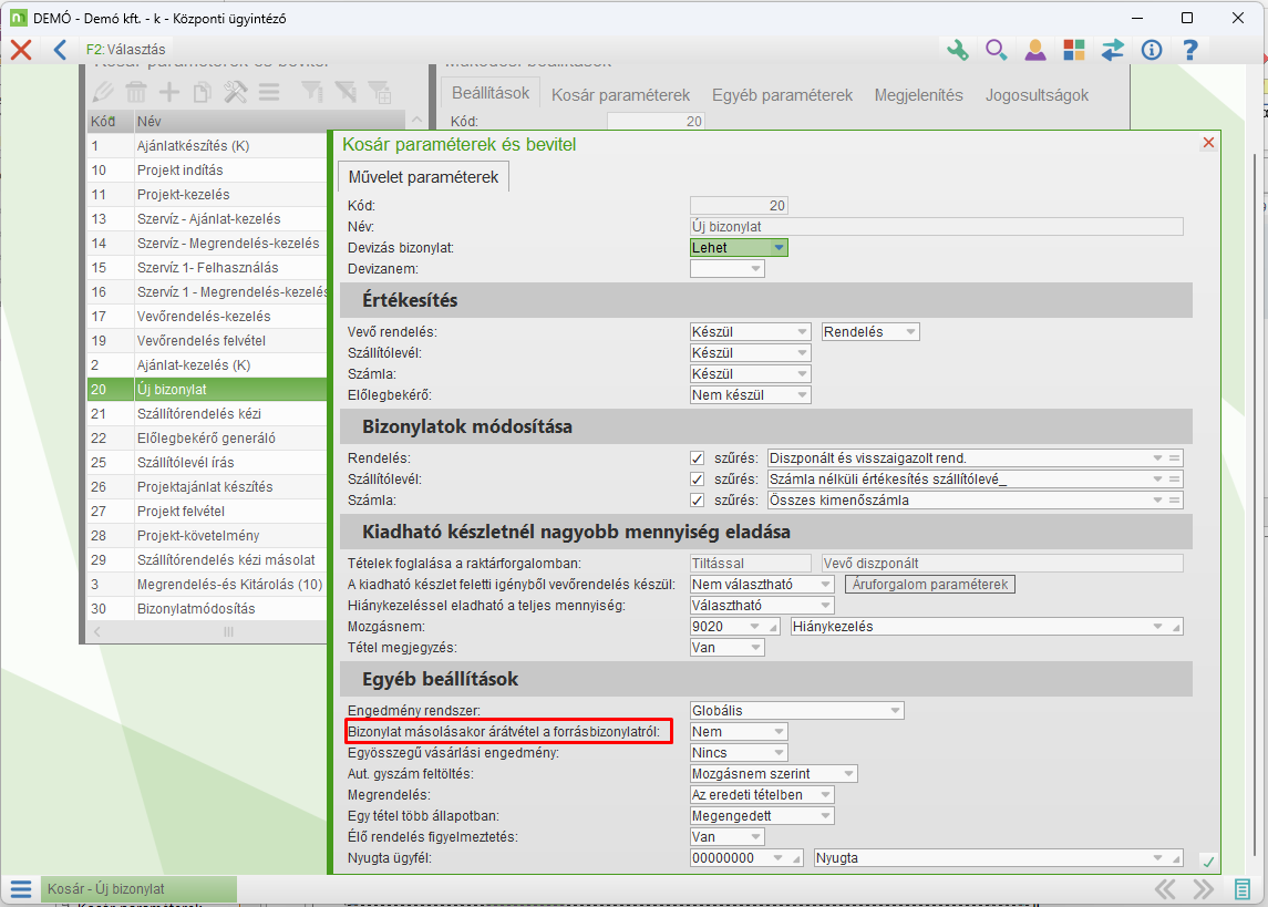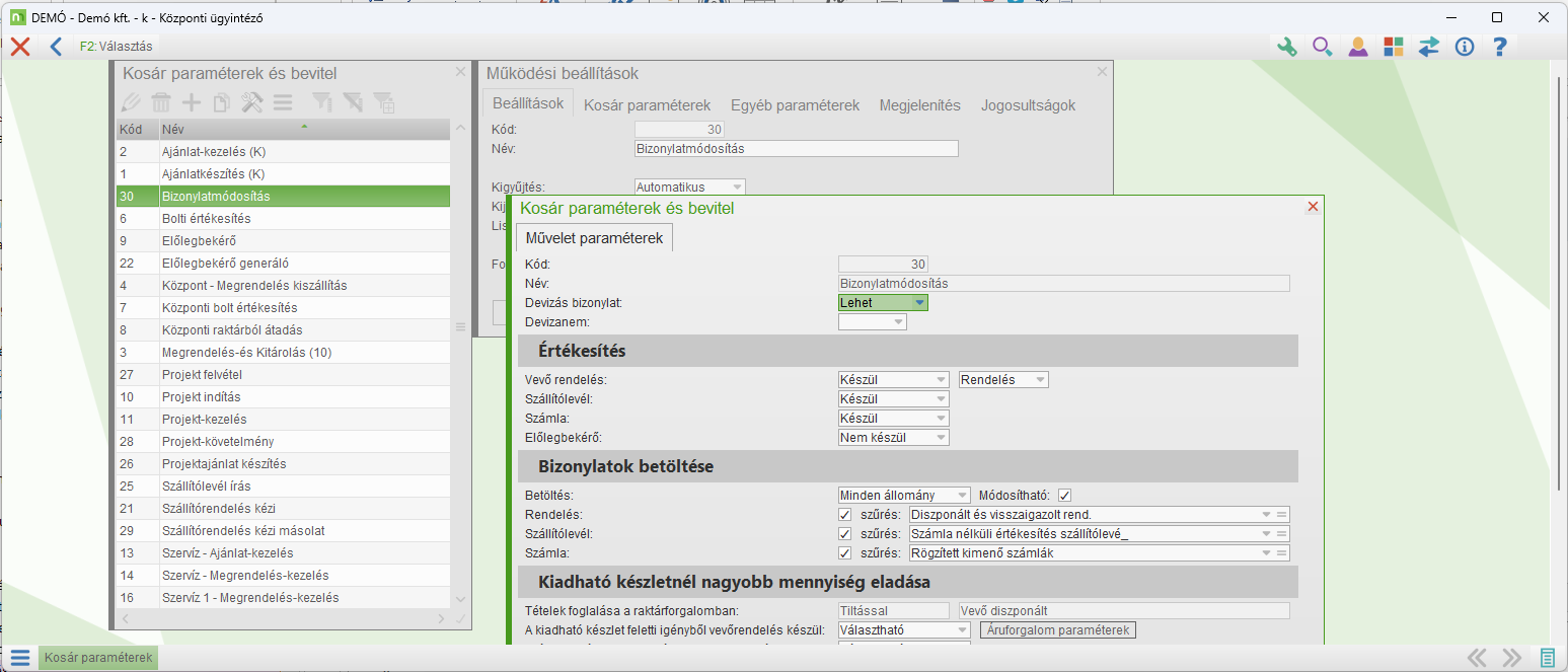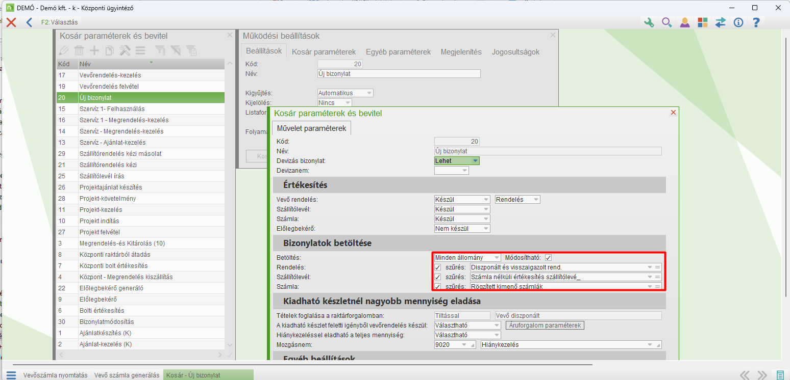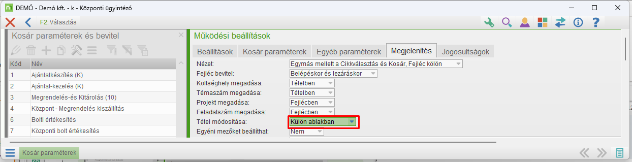 A Kosárparaméterekben megadható azoknak a bizonylatoknak a csoportja, amelyet az adott kosárban módosítani lehet.