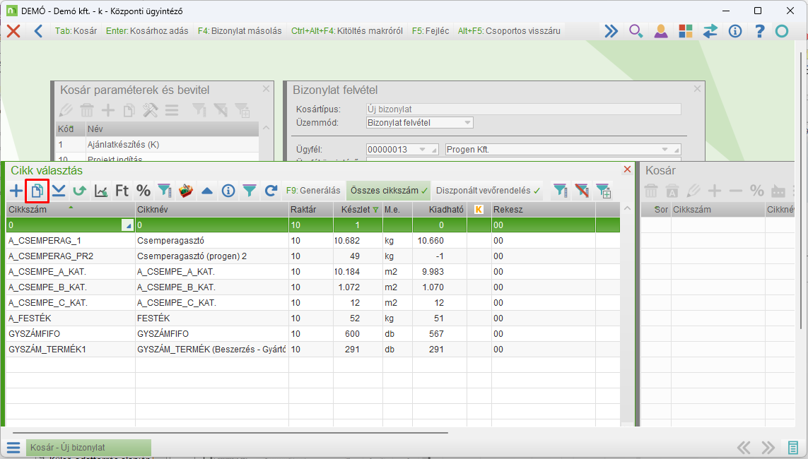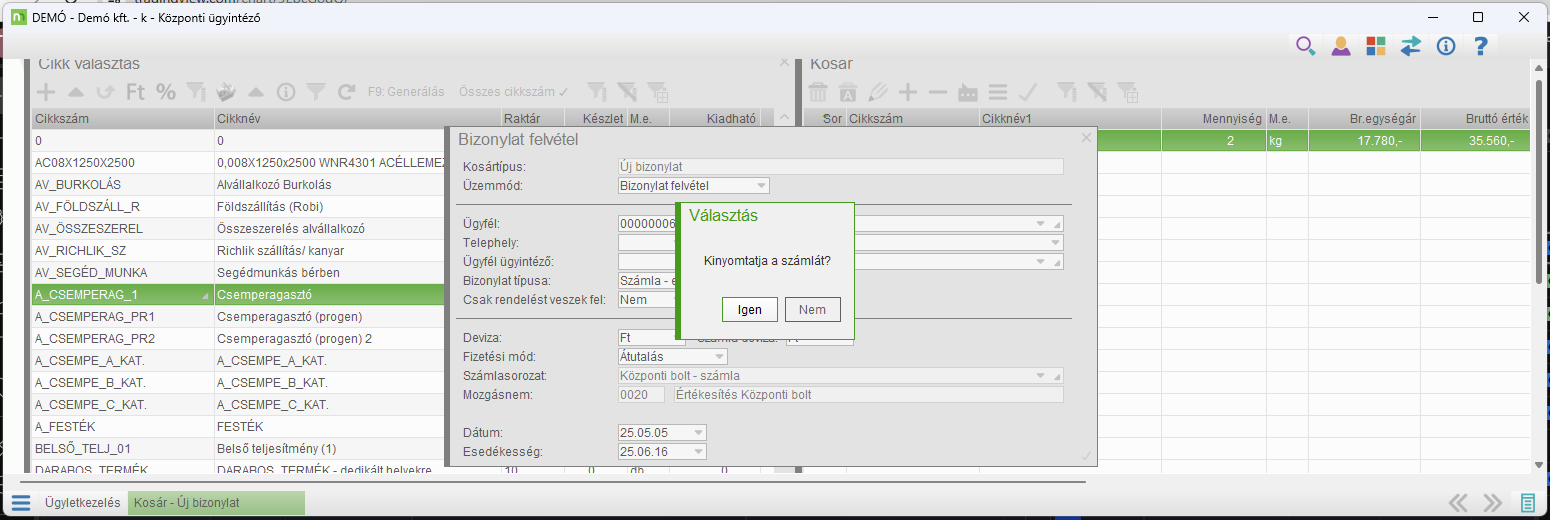 A kiválasztott bizonylat tételeit fogja a Kosárba átemelni a program.